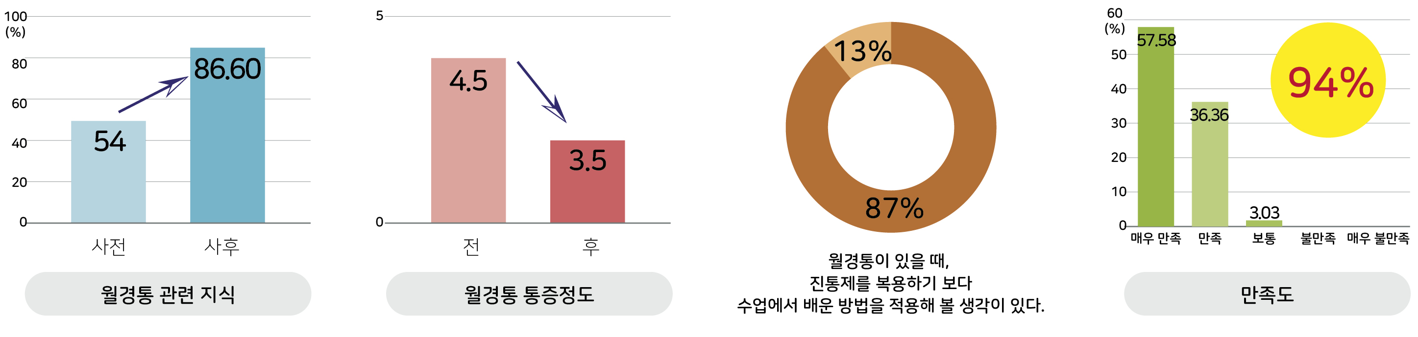 특히 사전 설문결과 월경통 통증정도(MMP) 평균수치가 4.5에서 교육 종료 후 3.5로 통증정도가 22% 감소했다.