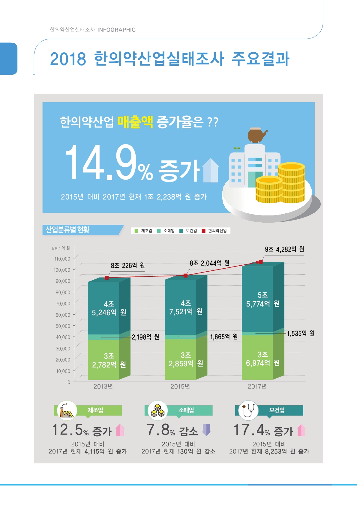 조사 결과 2017년 한의약 산업 매출액 총액은 9조4282억원으로 2015년도 대비 14.9%(1조2238억원) 증가했으며, 그 가운데 보건업은 17.4%(8253억원), 제조업은 12.5%(4115억원) 증가한 반면 소매업은 7.8%(130억원) 감소한 것으로 나타났다.