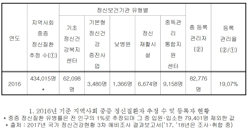 국회 보건복지위원회 김광수 민주평화당 의원이 보건복지부로부터 제출받은 '중증 정신질환자의 정신보건기관 등록관리율 현황' 자료를 보면, 2016년 기준 정신건강복지센터 등 정신보건기관에 등록된 중증 정신질환자는 보건당국이 추정한 지역사회 중증 정신질환자 43만4015명 중 8만2776명으로 19%의 등록 관리율을 보인 것으로 나타났다. 중증 정신질환자 10명 중 8명은 관리 사각지대에 놓여 있는 셈이다.
