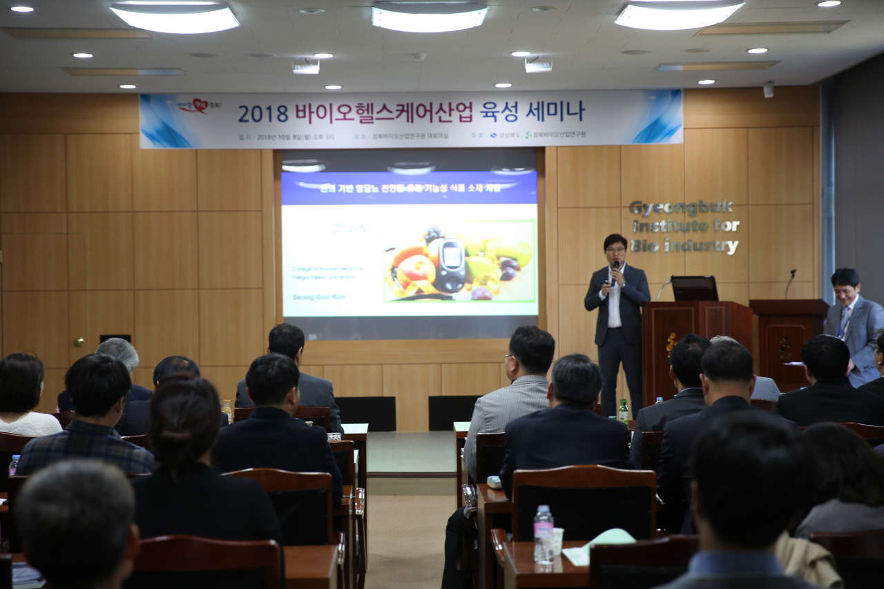 [한의신문=강환웅 기자] 대구한의대학교 한의학과 노성수 교수는 지난 8일 경북바이오산업연구원에서 이철우 경북도지사를 비롯한 유관기관 관계자 40여명을 대상으로 경북지역의 신성장 산업과 미래먹거리 산업 육성을 위한 '바이오헬스케어산업 육성 세미나'에서 주제 발표를 했다.