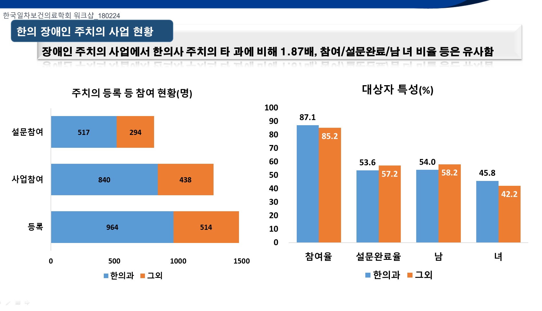 또한 손지형 국립재활원 한방재활의학과장은 "현장에서 장애인 환자들을 치료해보면 처음에는 '한의사도 장애인을 치료할 수 있나요?'라는 반응을 보이지만, 치료를 받은 후에는 한의치료에 대한 높은 만족도를 보인다"며 "한의계에서는 한의 장애인주치의 제도에 대한 좋은 모델 개발과 더불어 홍보 부분에도 더욱 신경을 써나간다면 장애인들의 건강 증진은 물론 삶의 질 향상에도 한의약이 큰 역할을 해나갈 수 있을 것"이라고 밝혔다.