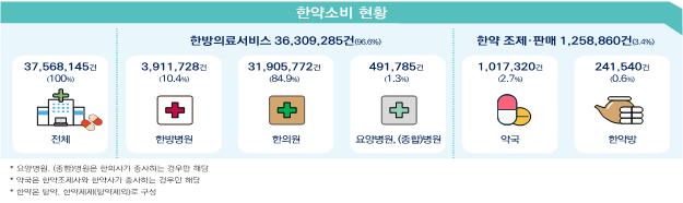 한약소비기관의 2016년 연간 탕약 및 한약제제 소비 건수는 한의의료기관이 96.6% 그중에서도 한의원(84.9%)이 가장 큰 비중을 차지했으며 한약 조제‧판매기관(한약조제약사 또는 한약사가 근무하는 약국, 한약방)에서 3.4%를 소비했다.