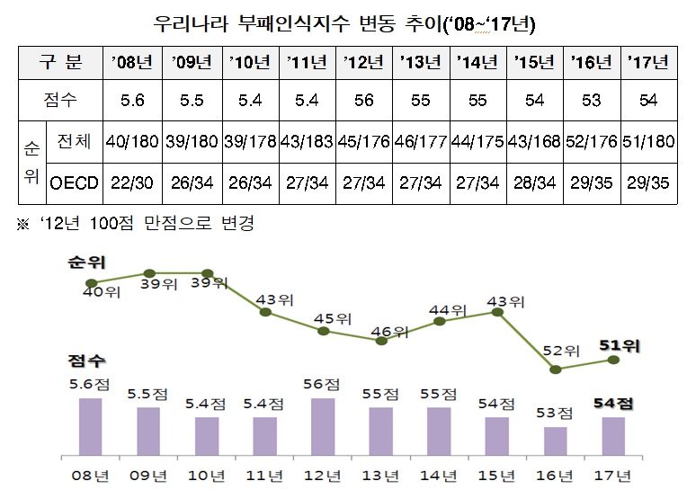 [한의신문=강환웅 기자] 최근 국제투명성기구(이하 TI)가 '2017년도 국가별 부패인식지수'(이하 CPI)를 발표한 가운데 우리나라는 100점 만점에 54점으로, 180개국 중 51위를 기록했다. 이는 전년과 비교해 1점 상승했으며, 순위는 1단계 상승했다.