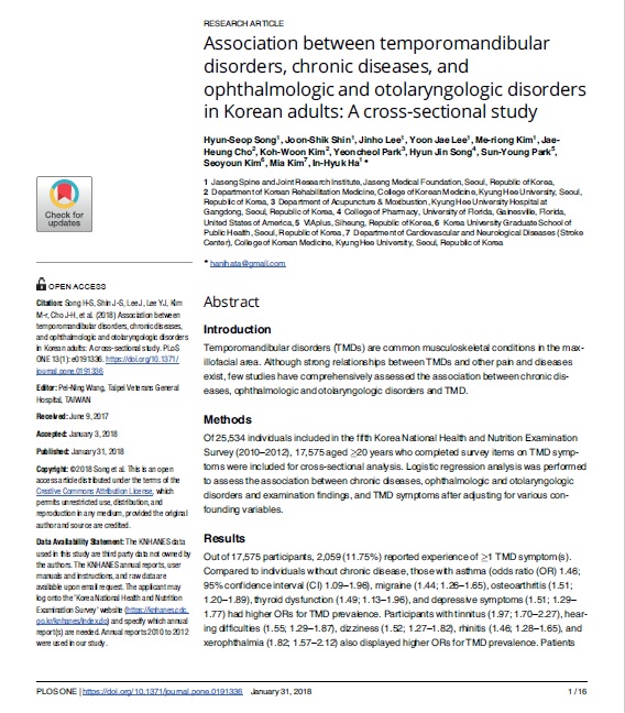 턱관절 장애는 근골격계 요인 이외에도 여러 요인에 의해 유발되는 경향이 있어 타 질환과의 연관성에 관한 연구가 증가하고 있음에도 불구하고 만성 질환 및 안이비인후과 질환의 연관성을 복합적으로 살핀 연구는 많지 않았다.