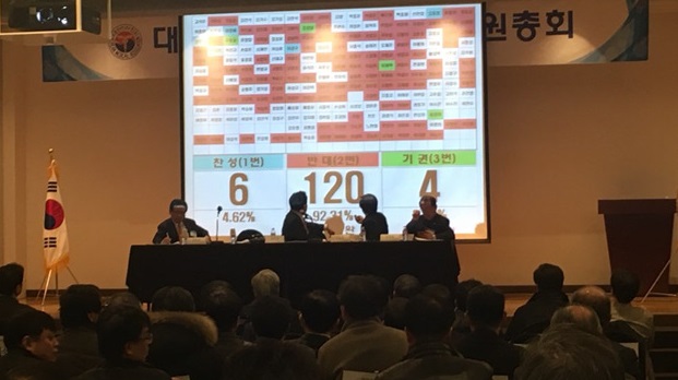 회장 불신임 안건을 상정하기 위해선 재적대의원의 3분의 2인 155명 이상의 대의원이 참석해야 했으나 이날 총회에는 전체 재적대의원 232명 중 125명만이 참석해 안건 상정을 위한 정족수를 채우지 못했다.