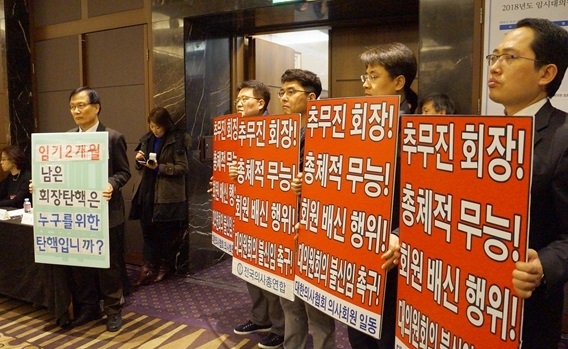 그동안 추무진 회장을 불신임하기 위한 시도는 수 차례 걸쳐 있었지만 실제 총회에 정식 안건으로 상정된 것은 이번이 두 번째다. 지난 해 9월 16일 임시총회에 상정된 불신임 건은 재적대의원 232명 중 181명이 참석해 찬성 106명, 반대 74명으로 나타나 의결 정족수 3분의 2 미달로 부결된 바 있다.