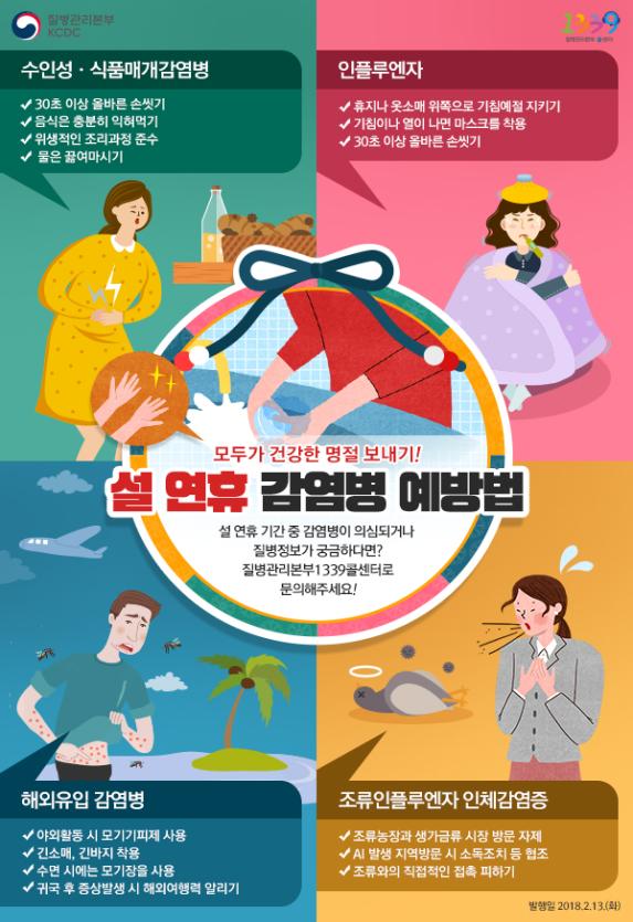 질본은 '설 연휴 감염병 예방수칙'을 발표하고, 연휴 기간 해외여행객 증가를 대비해 인천공항 등 전국 공항·만 국립검역소에서 해외감염병 예방·주의를 당부하는 홍보 캠페인을 13일부터 14일까지 실시한다.