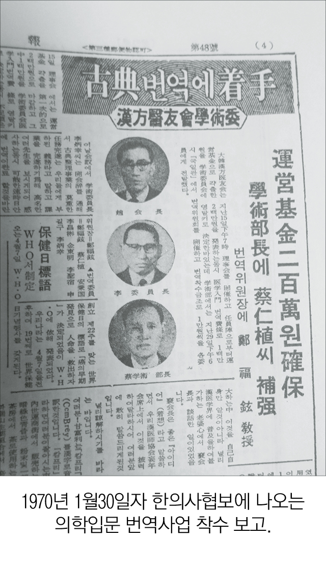 kni-web[한의신문] 1970년 1월15일 한의사 단체인 漢方醫友會에서 한의학 고전 번역사업의 일환으로서 『醫學入門』 번역 작업을 시작한다.