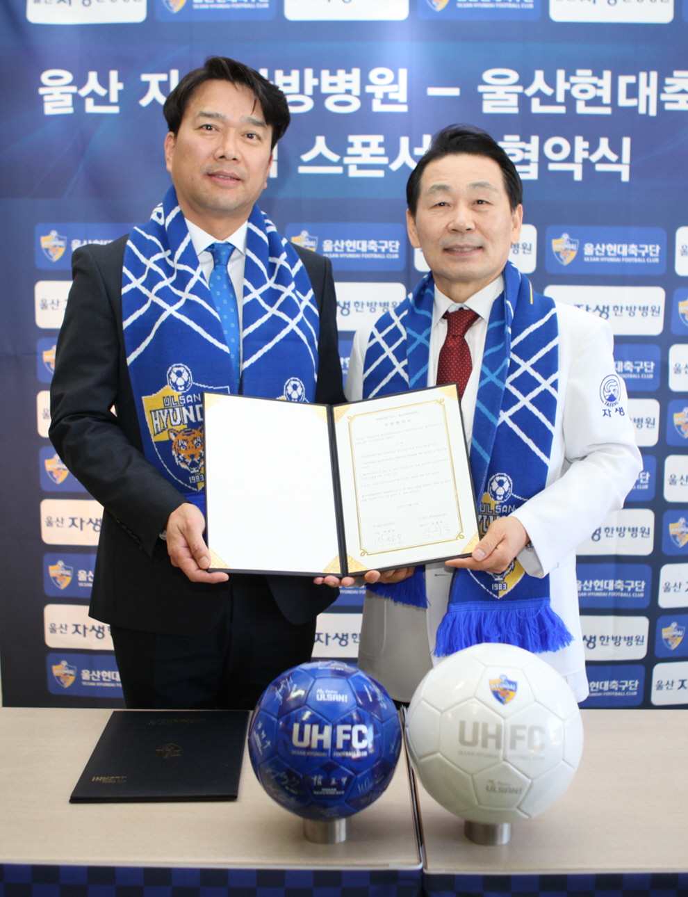 [caption id="attachment_391396" align="aligncenter" width="786"]울산현대자생한방병원 박병모 자생의료재단 이사장(오른쪽)과 김광국 현대중공업스포츠 대표이사가 공식 후원사 협약식을 마친 후 사진 촬영을 하고 있다.[/caption]