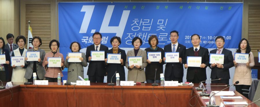 한편 이날 남인순(더불어민주당), 박광온(더불어민주당), 김관영(국민의당) 국회포럼1.4 공동대표는 국회 의원회관 제1세미나실에서 ‘국회포럼1.4’ 창립식 및 토론회를 개최하고 저출산 정책 패러다임 전환을 모색했다. 합계출산률 1.3명 미만의 초저출산을 넘어서자는 의미에서다.