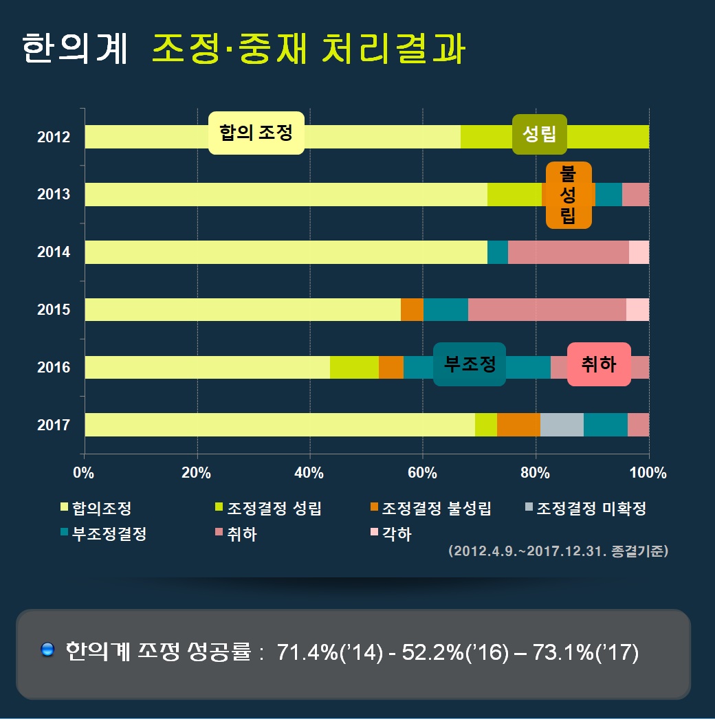 전체 조정 참여율은 2012년 47.4%에서 2017년 49.2%로 늘어난 한편, 한의계의 조정 참여율은 38.6%에서 57.3%으로 증가했다.