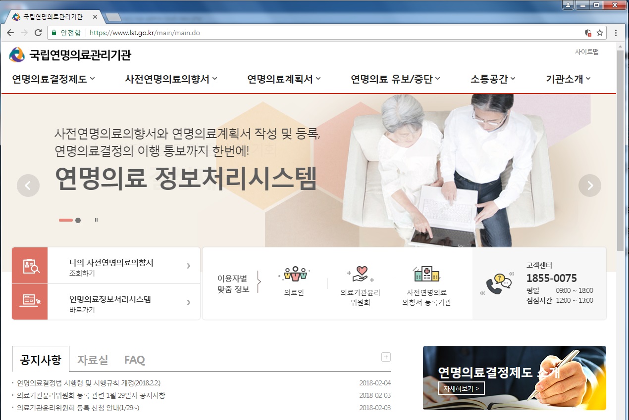 한편 2월4일부터 연명의료결정 제도가 본격 시행됨에 따라 연명의료결정법 상 요건을 충족하는 사람은 사전연명의료의향서와 연명의료계획서를 통해 연명의료(임종과정에 있는 환자에게 하는 심폐소생술, 인공호흡기 착용, 혈액투석 및 항암제 투여의 의학적 시술로서 치료효과 없이 임종과정만을 연장하는 것)에 관한 본인의 의사를 남겨놓을 수 있다.