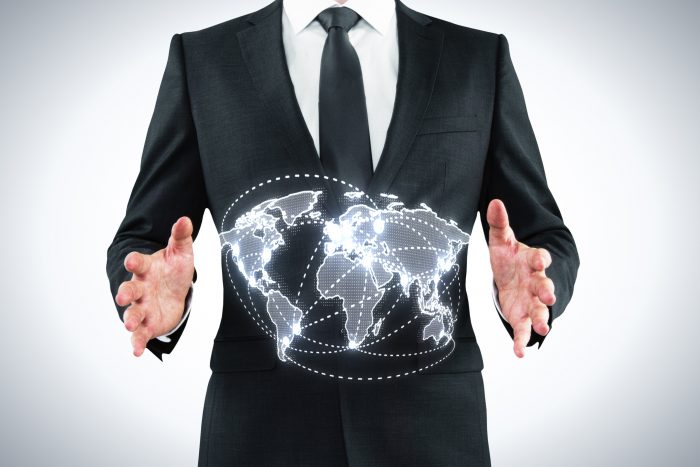 businessman holding world map interface on gray background