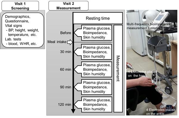 이를 위해 연구팀은 대전대 둔산한방병원과의 협력연구로 나이, 성별, BMI를 고려해 90명의 피험자당뇨병 환자 45명의 환자군, 정상인 45명의 대조군)를 모집한 후 피험자를 대상으로 음식을 먹기 전의 혈당과 생체 임피던스를 측정하고, 식후 30분 간격으로 2시간 동안 혈당과 생체 임피던스를 측정했다.