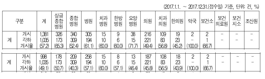 한국의료분쟁조정중재원, 2017 의료기관 종별 개시 현황 공개
