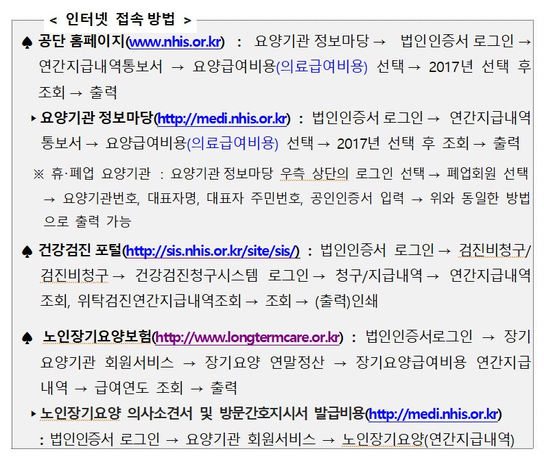 연간지급내역은 건보공단 홈페이지 요양기관정보마당, 건강검진기관 포털, 노인장기요양보험 홈페이지에서 법인인증서로 로그인하면 세무 신고시 필요한 '연간지급내역통보서'를 즉시 열람·출력할 수 있으며, 건보공단 인터넷회원에 가입하지 않은 요양기관과 휴·폐업 기관에 대해서는 우편으로 발송할 예정이다.