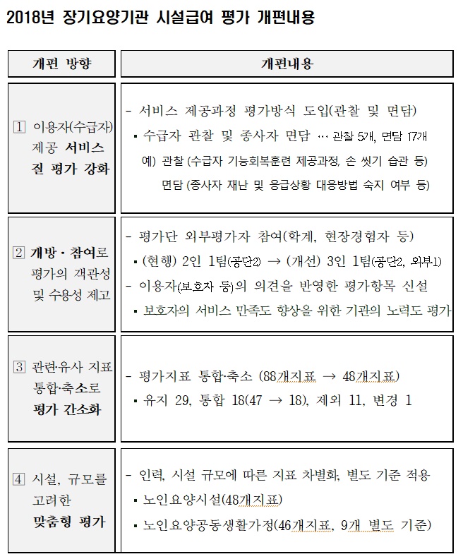 또한 맞춤형 평가를 위해 인력·시설 규모에 따라 노인요양공동생활가정과 노인요양시설의 평가지표와 평가기준을 달리하며, 연관성이 있고 유사한 평가지표를 통합·축소(88개→48개)해 평가를 간소화해 효율성을 도모할 예정이다.