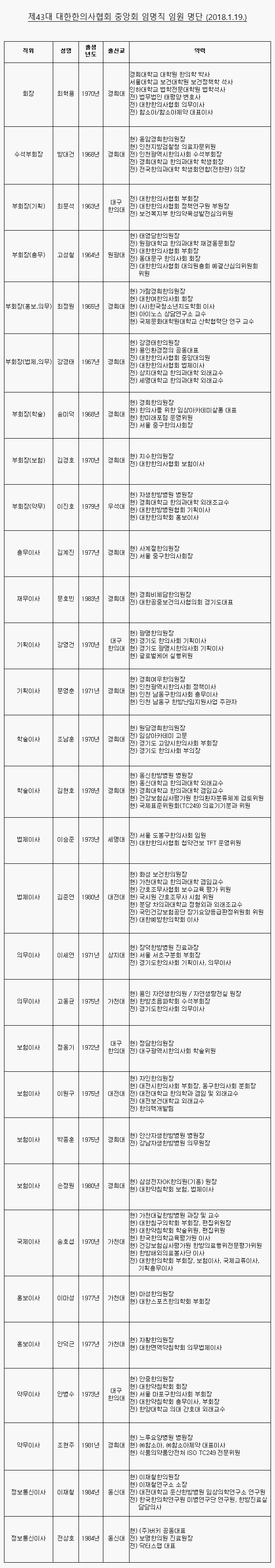 이 외에도 제43대 중앙회 이사로는 홍주의 서울시한의사회장, 윤성찬 경기도한의사회장, 최도영 대한한의학회장이 당연직 부회장으로 참여하고, 전국 최다 회원 수 분회인 박성우 강남분회장과 곽재영 성남시분회장이 무임소 이사로 활동한다.