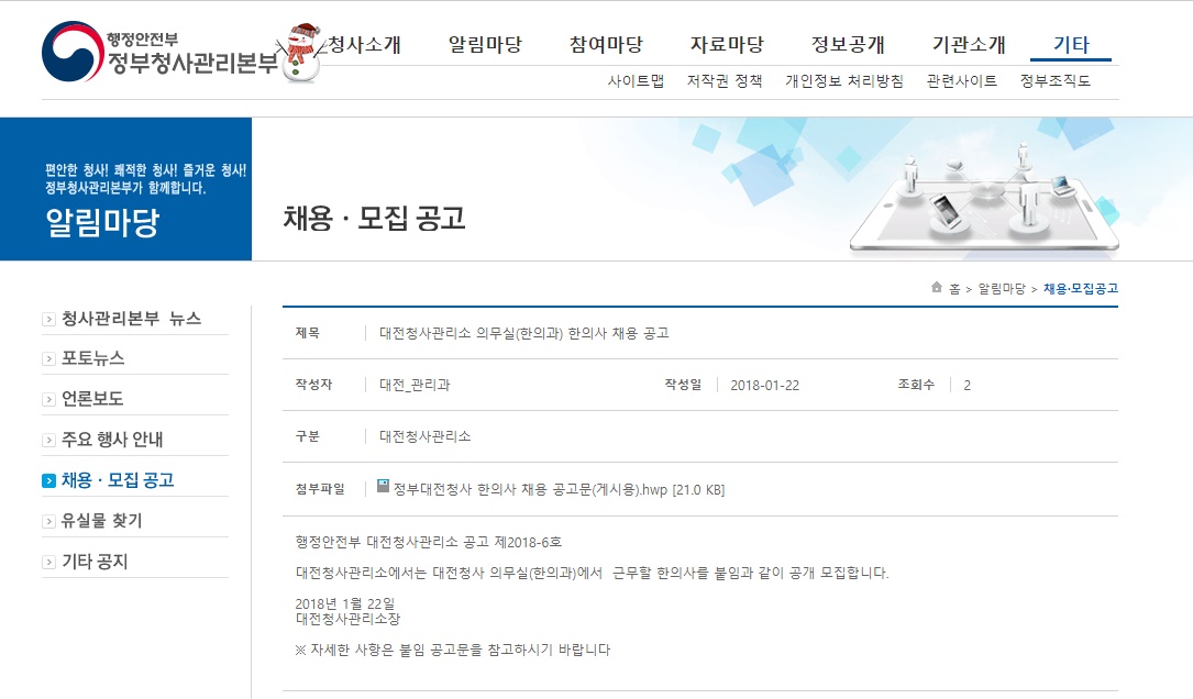 [한의신문=김대영 기자] 정부대전청사 의무실에서 근무할 한의사를 공개 모집 중이다.