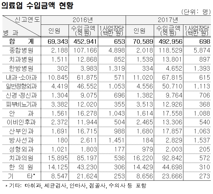국세청, 의료업 수입금액 현황 공개…병의원 1사업자당 평균 수입은 7억여원