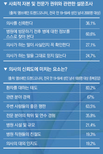 시장조사전문기업 엠브레인 트렌드모니터가 전국 만 19~59세 성인 남녀 2000명을 대상으로 ‘사회적 자본 및 전문가 권위와 관련한 설문조사’를 실시한 결과 단 36.1% 만이 의사를 신뢰한다고 답했다.