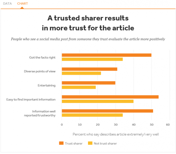 미 아메리칸 보도 연구소(API)와 AP통신 NORC 공공홍보센터가 성인 1489명을 대상으로 소셜 미디어에서 사람들의 뉴스 인식에 어떻게 영향을 미치는지 테스트 한 결과에서 유명매체가 배포한 뉴스일수록 더욱 신뢰하는 경향을 보였다.
