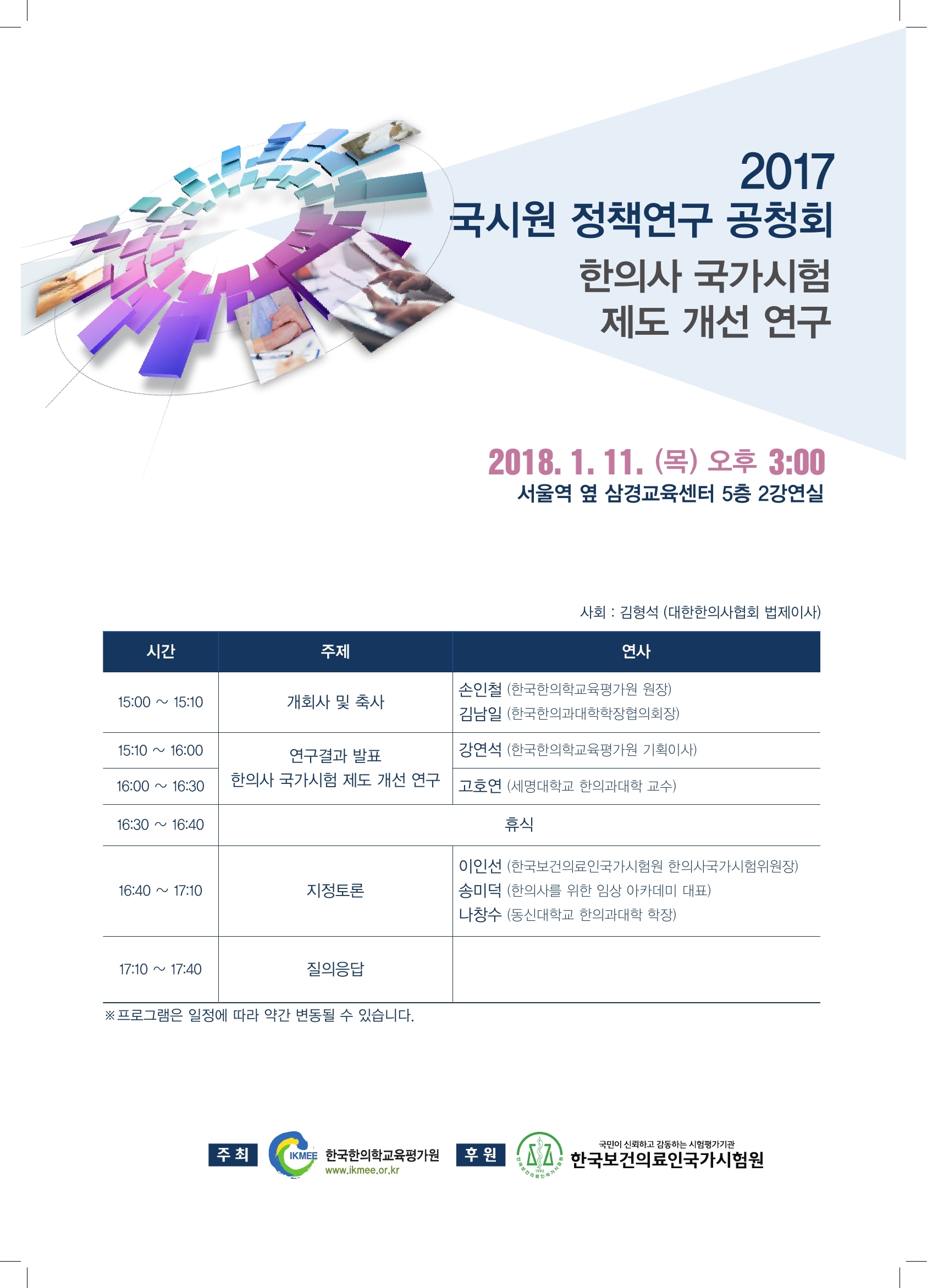 공청회는 강연석 한평원 기획이사와 고호연 세명대학교 한의과대학 교수가 한의사 국가시험 제도 개선에 대한 연구 결과를 발표한 후 지정토론, 질의응답을 하는 순서로 진행된다. 지정토론에는 이인선 한국보건의료인국가시험원 한의사국가시험위원장, 송미덕 한의사를 위한 임상 아카데미 대표, 나창수 동신대학교 한의과대학 학장 등이 참여한다.