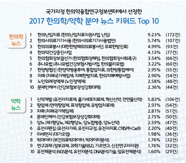 한편 한의학과 더불어 진행된 약학 분야 뉴스 키워드는 △신약 개발 5.83% △항암제 2.97% △치매 2.81% △문재인케어 2.75% △당뇨 2.59% △유전자편집 2.20% △미세먼지 1.98% △빅데이터 1.76% △연구과제 1.76% △유전체 분석 1.60% 등의 순으로 나타났다.