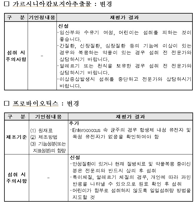 [한의신문=최성훈 기자] 가르시니아캄보지아추출물(HCA 추출물)과 프로바이오틱스 등 기능성 원료 8종에 대한 섭취 시 주의사항 등이 변경된다.