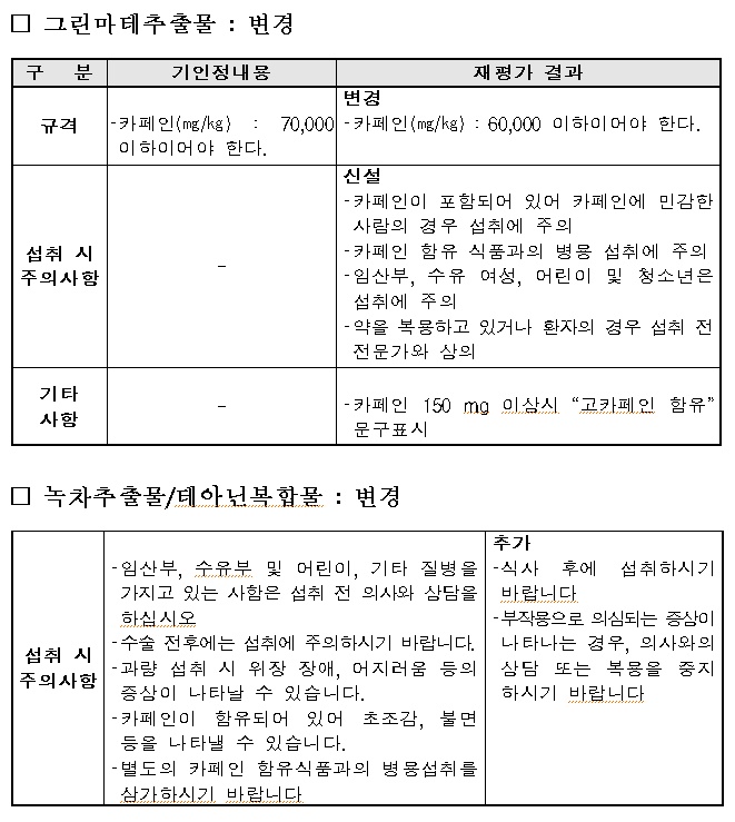 ‘녹차추출물’과 ‘녹차추출물/테아닌복합물’은 기능성분(지표성분)인 카테킨을 구성하는 성분 중 하나인 ‘에피갈로카테킨갈레이트(EGCG)’가 섭취자의 상태 및 섭취량에 따라 간독성 유발 가능성이 있다고 보고되고 있어 EGCG 일일섭취량을 설정해(300 mg EGCG/일 이하) 적용했다.