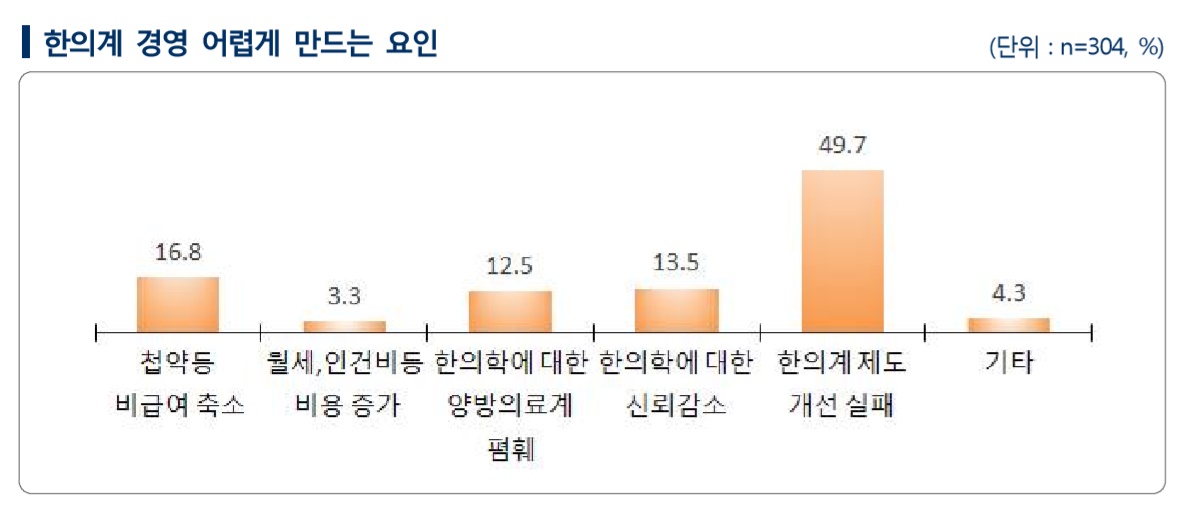 이 같은 경영의 어려움을 초래하는 이유로는 건강보험 급여 확대 등 한의계 제도 개선 실패라는 답변이 49.7%로 가장 많이 나타났으며, 첩약 등 비급여의 축소 16.8%, 국민들의 한의학에 대한 신뢰 감소 13.5%, 한의학에 대한 양방의료계의 폄훼 12.5% 등의 순으로 응답했다.