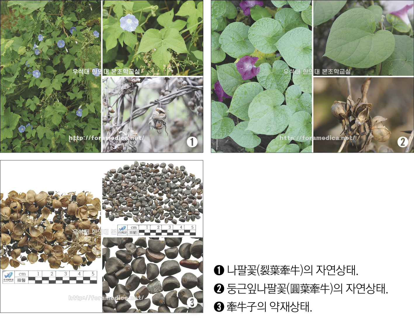 ③ 정품 牽牛子는 三棱狀卵形이며 표면의 활처럼 굽은 背面에는 한 개의 얕은 縱溝가 있으며, 腹面의 稜線에 가까운 곳에 약간 움푹한 하나의 種臍가 있는 것이 육안상 특징이다. 보다 적극적인 방법으로 물에 담가 놓으면 種皮가 찢어지는데, 손으로 문지르면 매끄럽고 끈끈한 느낌이 있는 것으로 보완이 가능하다.