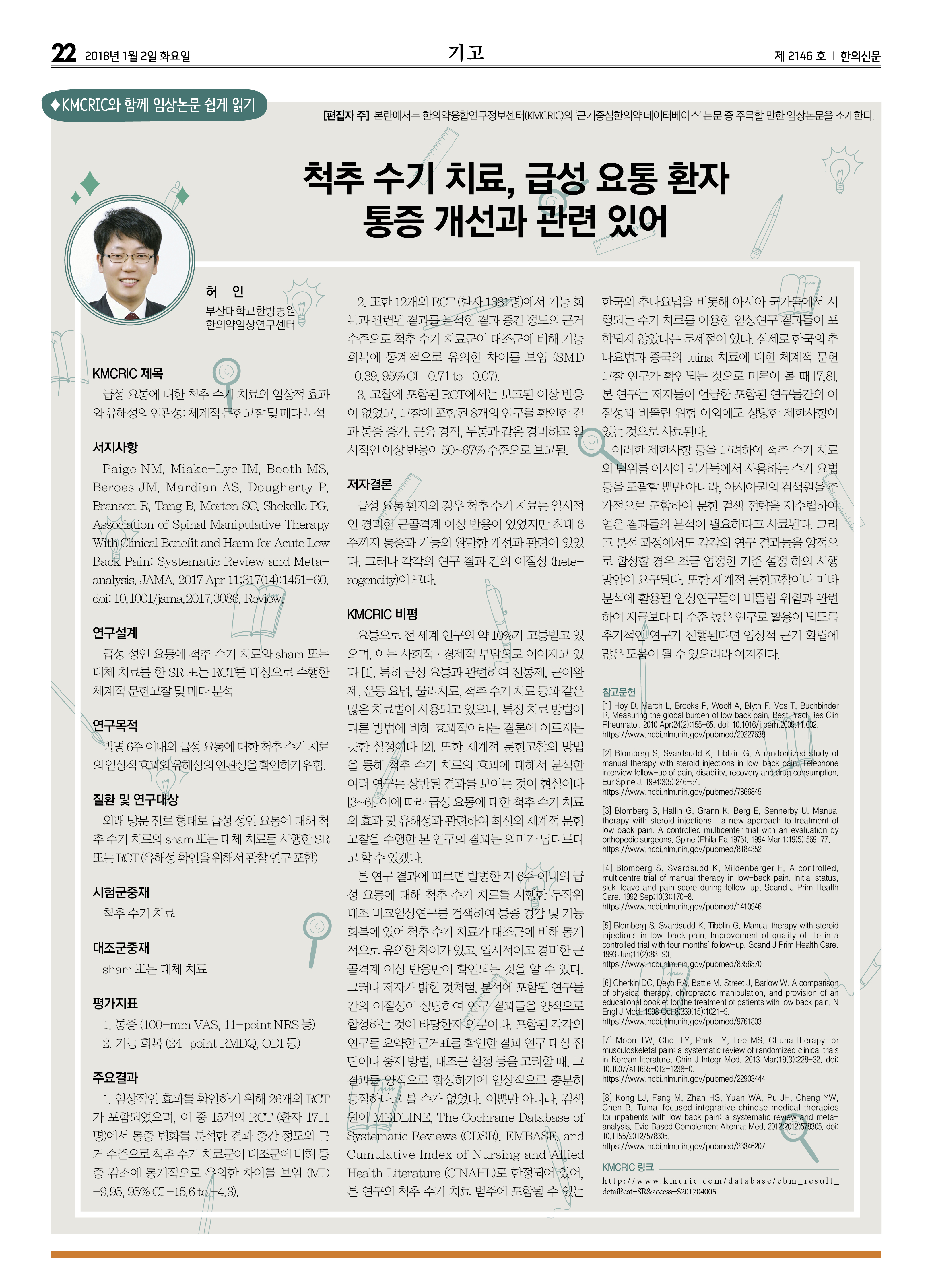 또한 체계적 문헌고찰의 방법을 통해 척추 수기 치료의 효과에 대해서 분석한 여러 연구는 상반된 결과를 보이는 것이 현실이다 [3~6].
