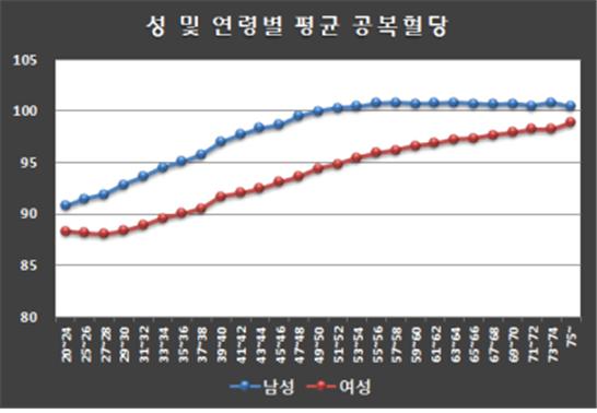 혈당 참조표준을 활용해 성별·연령별 혈당의 분포와 변화 등을 확인한 결과 남성과 여성 모두 20대에 공복 혈당이 가장 낮았고, 남성은 50∼60대에, 여성은 연령이 증가할수록 공복혈당이 높았으며, 전체 연령에 걸쳐 남성의 공복혈당 평균이 여성보다 높은 것으로 나타났고, 특히 40∼50대에서 큰 차이를 보이는 것으로 분석됐다.