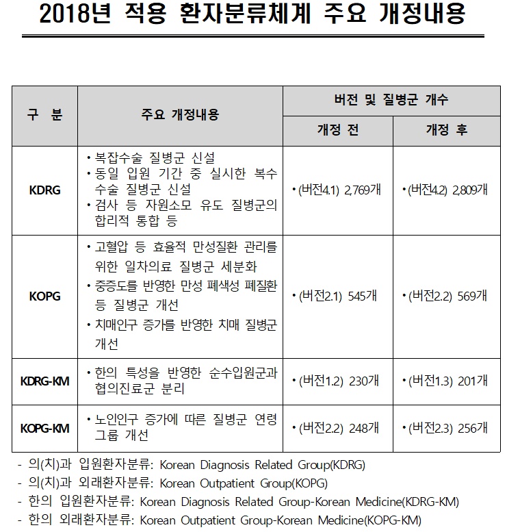 심평원은 지난 1년간 개정된 행위분류 등을 반영한 진료비 변화 분석을 통해 자원 소모와 임상적 측면의 유사성을 고려해 이번 환자분류체계를 개정했으며, 호주와 미국의 모형을 기반으로 사용해 오던 중증도 분류 기준을 임상의학회와 2년간의 검토 과정을 거쳐 합리적으로 개선했다.