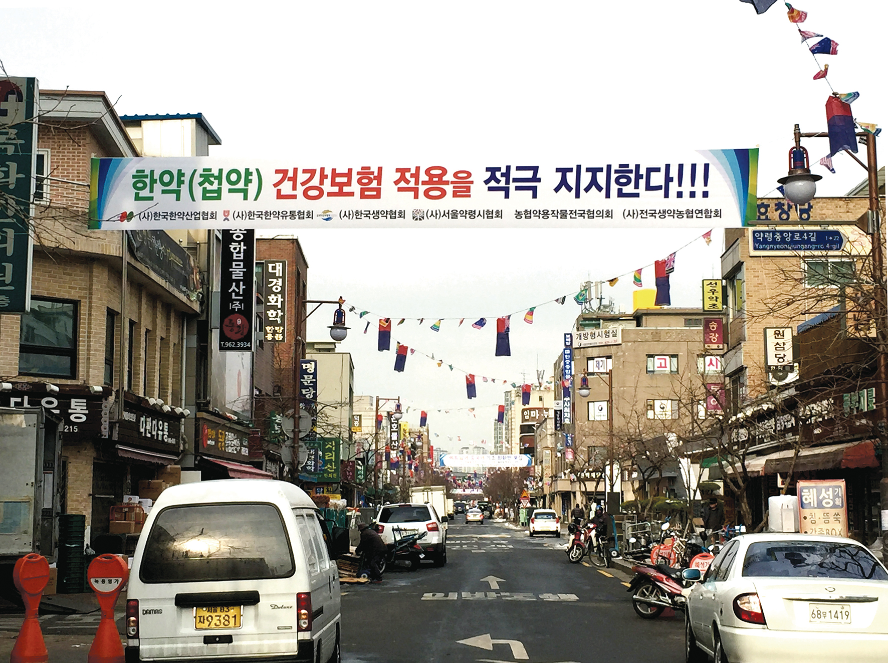 서울약령시장 내에 게시돼 있는 한약(첩약) 건강보험 적용 지지 현수막.