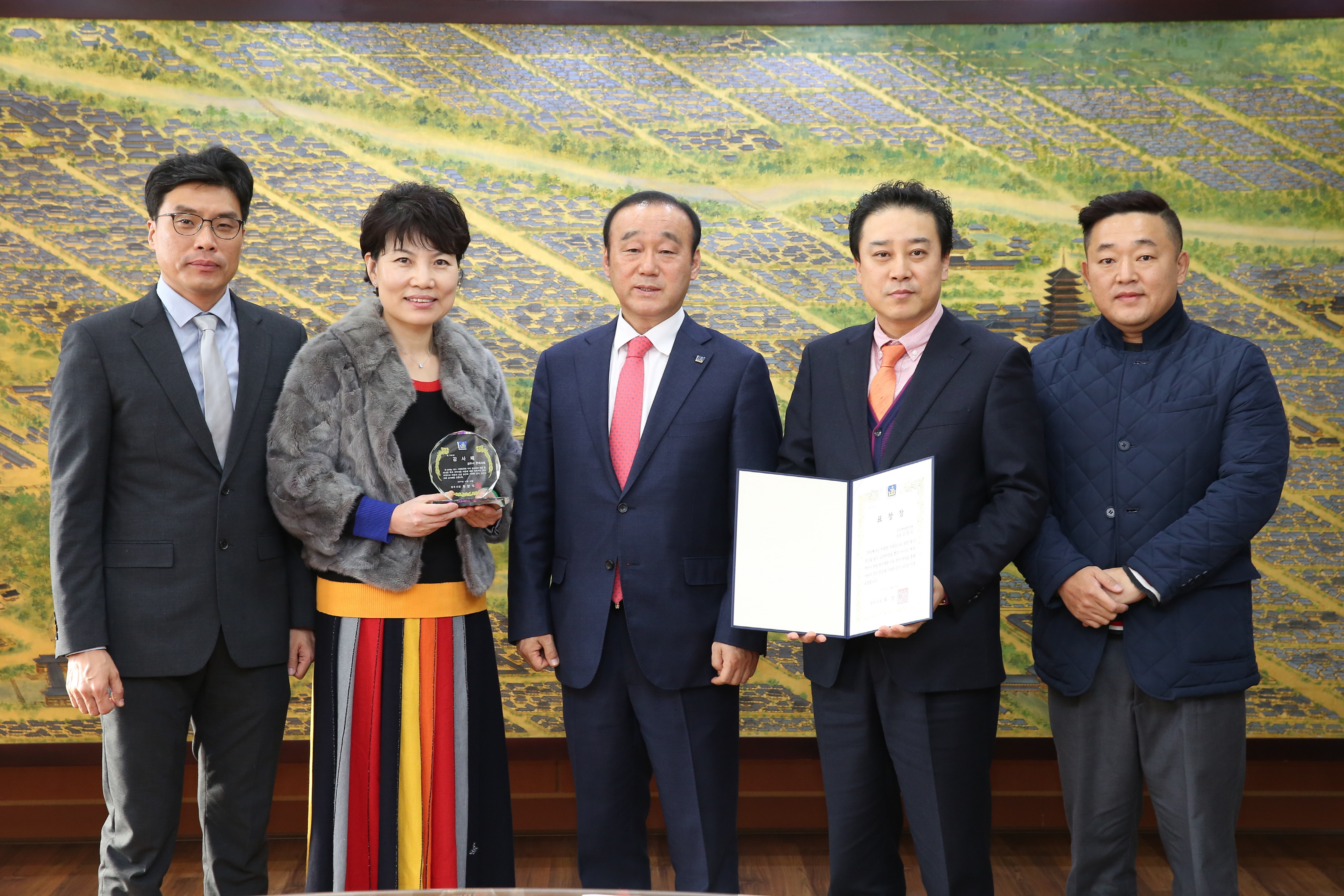 양영이 경상북도 경주시한의사회 회장이 지난 19일 경주시청으로부터 감사패를 수상한 후 시청 관계자들과 기념촬영을 하고 있다.