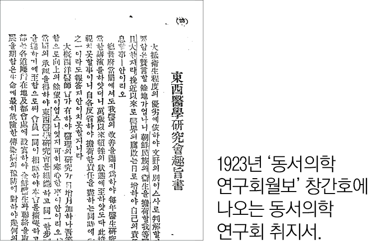 [한의신문] 1923년 『東西醫學硏究會月報』 창간호가 간행된다. 『東西醫學硏究會月報』는 東西醫學硏究會에서 간행한 학술잡지로서 한의학과 서양의학과의 회통을 모토로 삼았다.