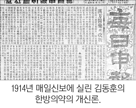 kni-web[한의신문] 1914년 6월24일자 『每日申報』에는 한의사 金東薰의 ‘漢方醫學의 改新’이라는 제목의 글이 게재되어 있다.