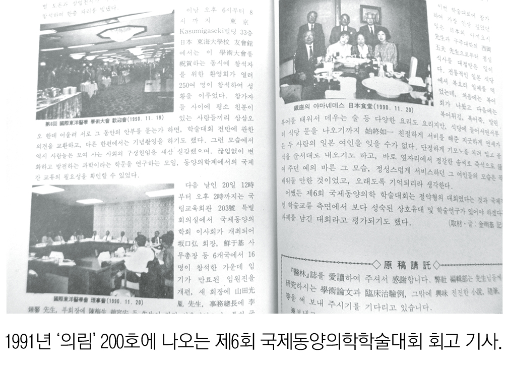 1990년 10월 19일부터 21일까지 3일간 제6회 國際東洋醫學學術大會가 일본에서 열렸다. 이 대회는 23개국에서 모두 1660명이 참석했고, 주제는 「傳統과 科學」이었다. 우리나라에서는 53명의 인사들이 본 학술대회에 참석하기 위해 일본으로 출국했다.