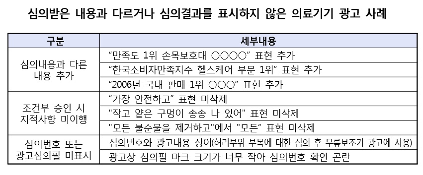 이와 함께 현재 의료기기법에서는 의료기기를 광고하려는 자는 식품의약품안전처장의 심의를 받고 그 결과를 표시하도록 규정하고 있지만 이번 모니터링 결과 이를 준수하지 않은 의료기기 광고가 21건(14.8%) 확인됐으며, 세부적으로는 △심의받은 광고내용과 다른 내용을 추가 11건 △조건부 승인시 지적사항(표현 수정·삭제) 미이행 5건 △심의번호 또는 의료기기 광고심의필 미표시 5건 등으로 나타났다.