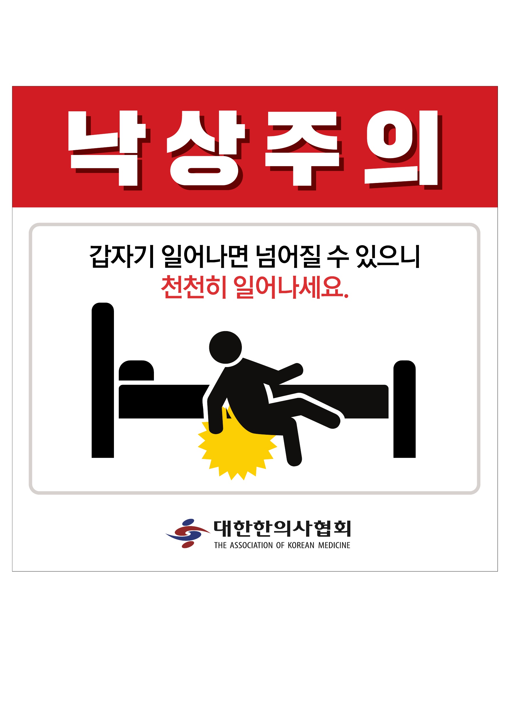 이런 가운데 대한한의사협회(이하 한의협)에서는 이 같은 낙상 사고를 방지하기 위한 '환자 주의 안내문'을 제작해 한의의료기관에서 원내 게시 등을 통해 적극 활용할 수 있도록 하고 있다.