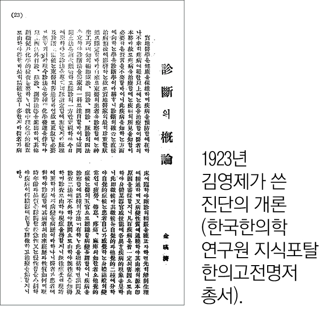 본 창간호에는 金暎濟라는 한의사가 ‘診斷의 槪論’이라는 제목의 아래와 같은 논문을 게재하고 있다. 金暎濟(1872〜1934)는 1914년 의생면허를 취득했고, 경남 하동군 하동면 미전리가 주소인 것으로 파악된다(박훈평 편저, 『일제강점기 의생 총목록 1』, 한국의학사료총서1, 한국한의학연구원, 2017).