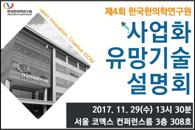 [한의신문=김대영 기자] 한국한의학연구원(이하 한의학연・KIOM)이 오는 29일 서울 코엑스에서 ‘2017 한국한의학연구원 사업화 유망기술 설명회’를 개최한다.