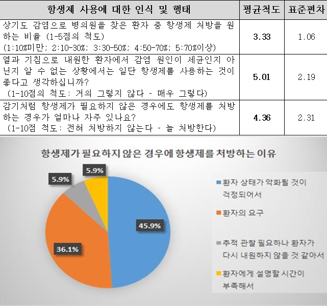 그런데 의사를 대상으로한 인식도 조사에서는 환자 중 30~50%에서 항생제 처방을 원했다고 응답해 서로 다른 결과를 보였다.