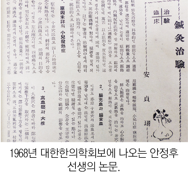 安貞珝 先生이 1971년 지은 『(自律神經不調症의 調節과)鍼響의 硏究』라는 책은 그의 鍼法을 정리한 것으로, 수많은 治療醫案들이 기록돼 있다. ‘鍼響’이란 용어는 그가 창작한 단어로서 사전적 의미로 ‘침의 울림’이라는 뜻이다. 1968년 8월 간행된 『대한한의학회보』제3권 제3호(총권 17호)에는 安貞珝 先生의 ‘鍼灸治驗’이라는 제목의 논문이 실려 있다. 이 논문의 서론에서 그는 다음과 같이 말하고 있다.