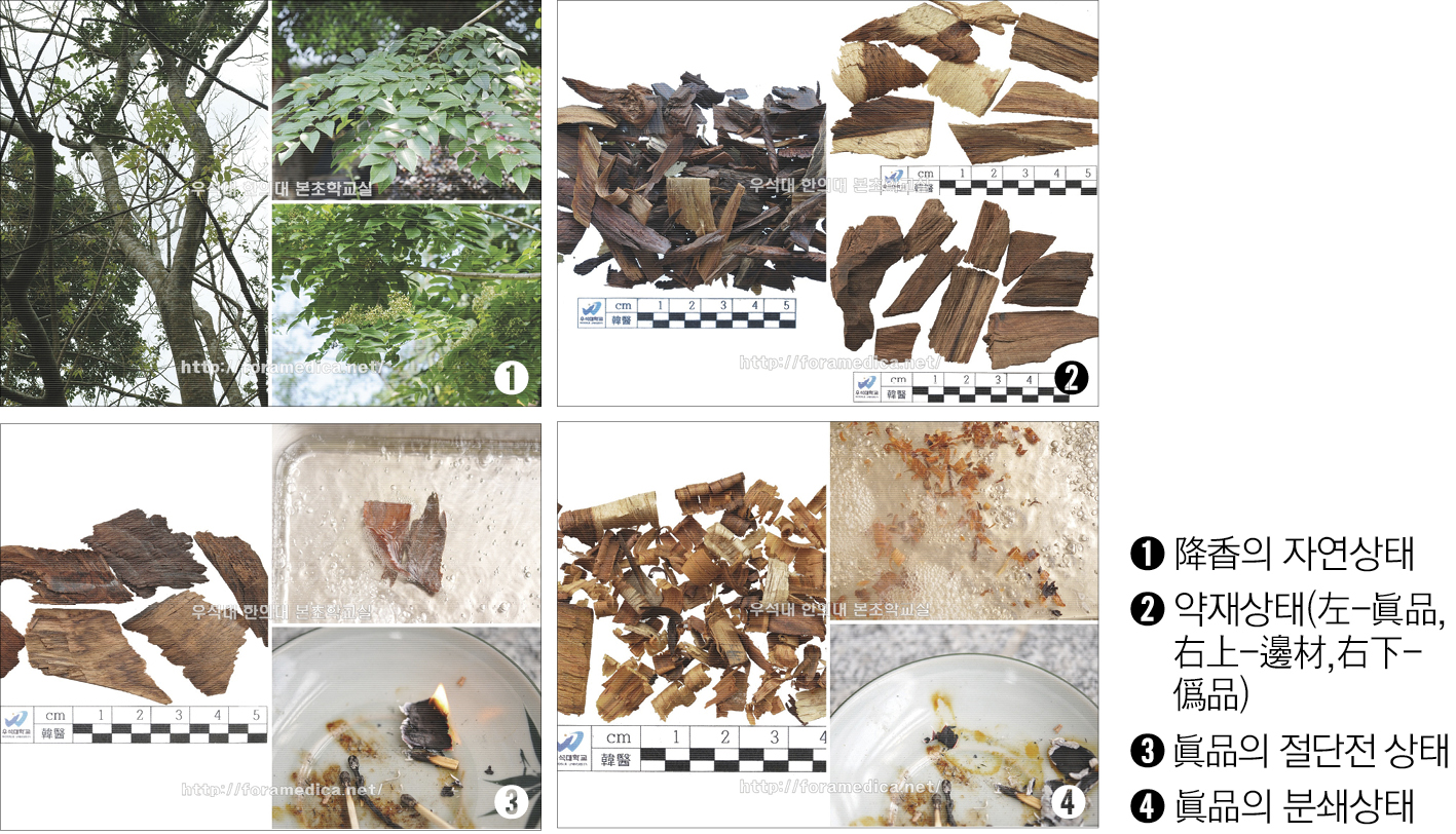 降香은 콩과(Leguminosae)에 속한 落葉喬木인 강향단(降香檀) Dalbergia odorifera의 줄기와 뿌리의 心材(KHP, CP)이며 강진향(降眞香)이라 부르기도 한다. 降香의 대체품으로는 정품 降香이 정립되기까지 시장의 대부분은 印度黃檀 D. sissoo과 印度紫檀 Pterocarpus indicus이었다.