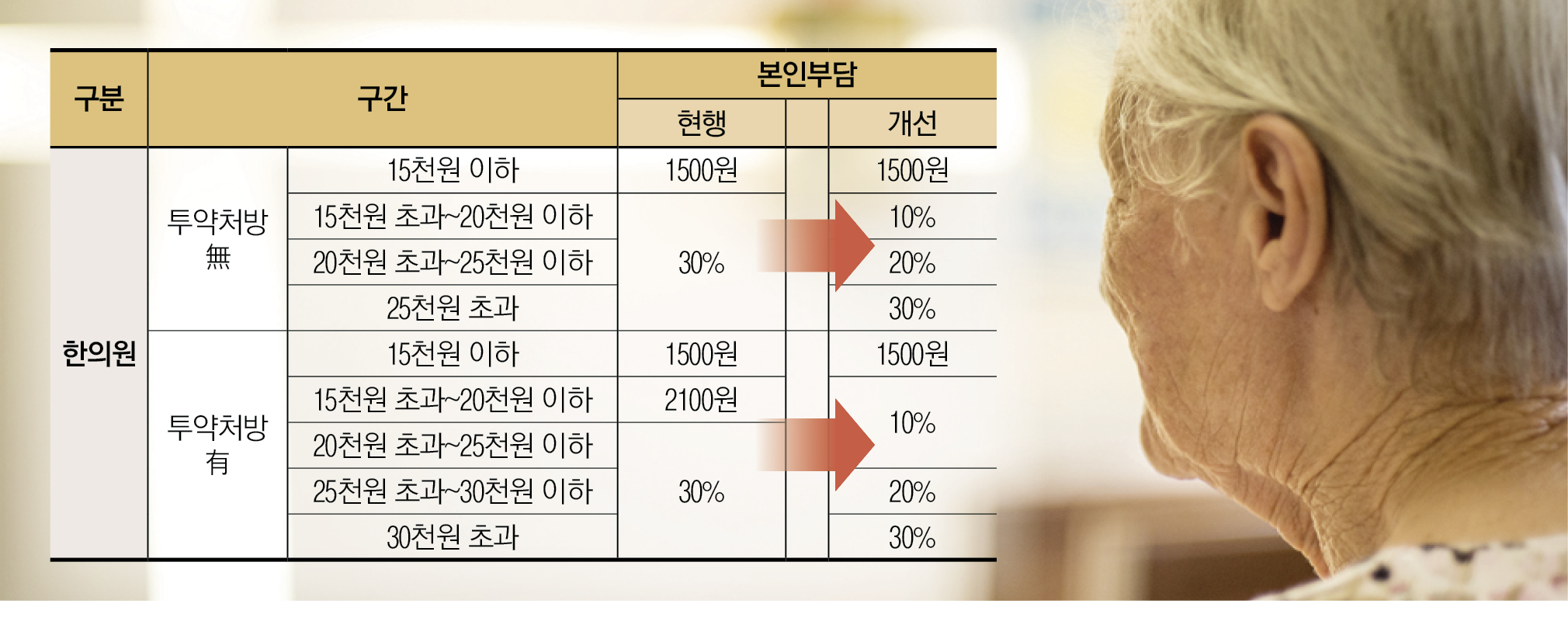 개선안에 따르면 투약 미발생시 한의원의 경우 1만 5000원 초과 2만원 이하 구간의 본인부담액은 기존 30%에서 10%로 하향 조정된다. 2만원 초과 2만 5000원 이하 구간은 20%, 2만 5000원 초과 구간은 30%로 차등 적용된다.