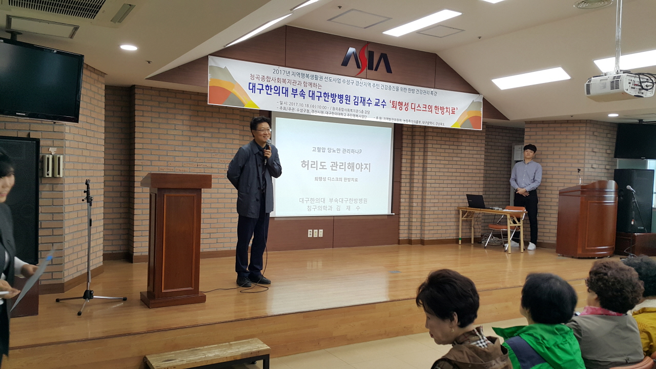 지난 18일 대구 수성구 청곡종합사회복지관 강의실에서는 지역 주민 150여명을 대상으로 대구한방병원 김재수 교수가 ‘허리도 관리해야지’라는 주제로 건강강좌를 실시했다.