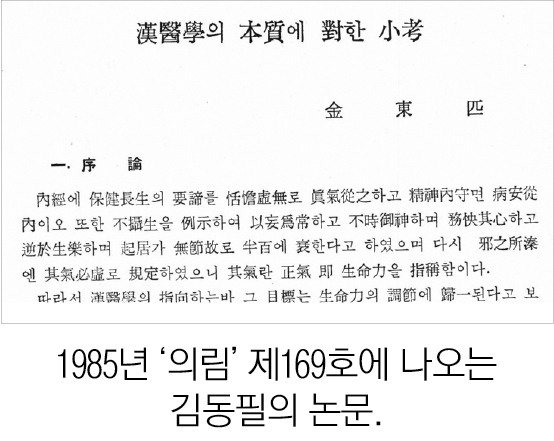 kni-web[한의신문] 金東匹 先生은 1985년 『醫林』 제169호에 「한의학의 本質에 대한 소고」라는 제목의 논문을 발표한다. 金東匹 先生은 당시 부산시 중구 부평동 瑞林한의원 원장이었다. 金東匹은 일찍이 한의사 李在元에게서 舍岩道人鍼法을 사사한 후 이 분야에 대한 연구를 평생 동안 진행한 한의사이다.